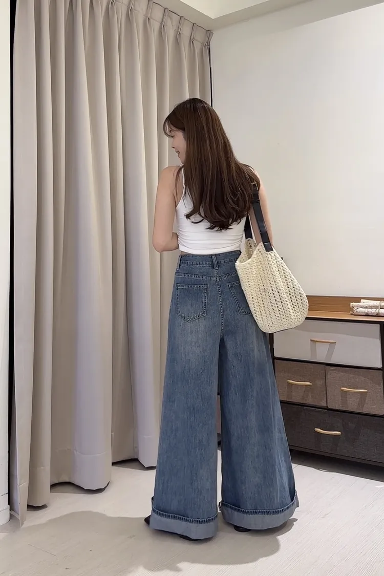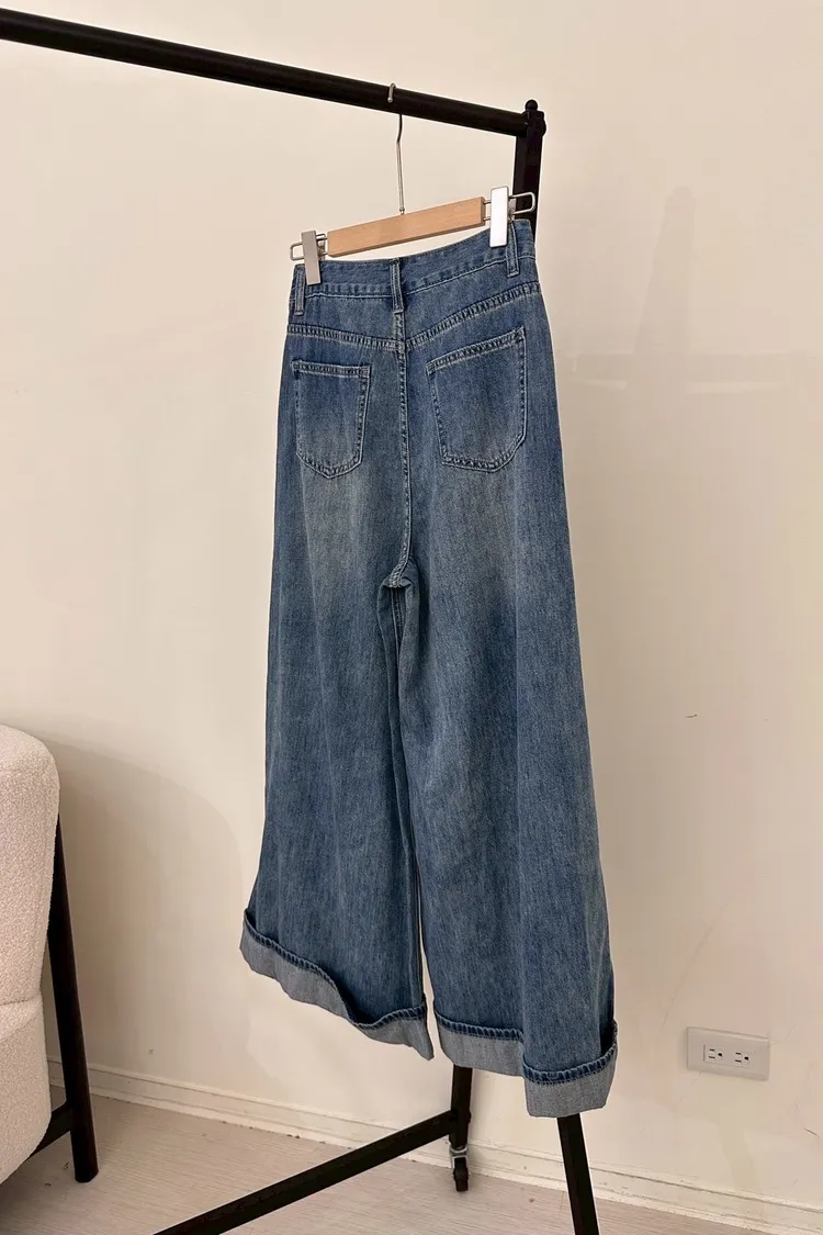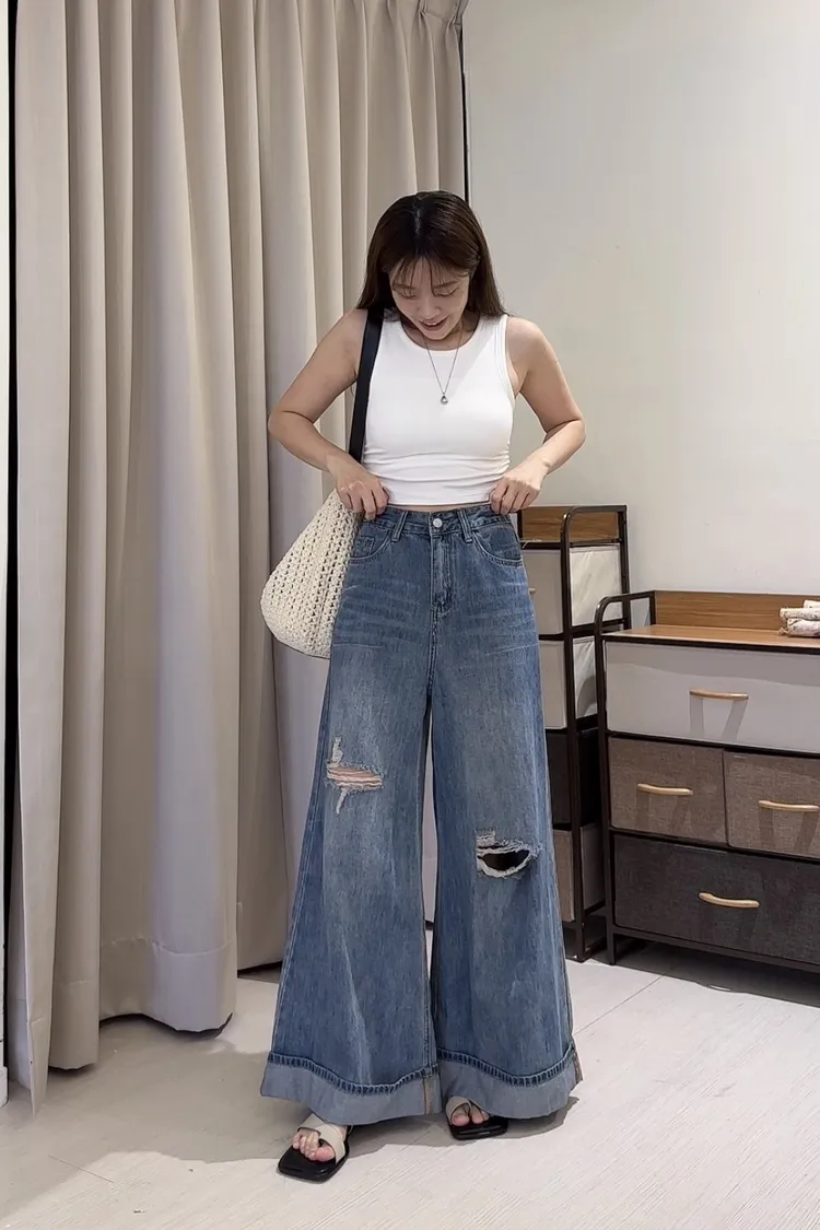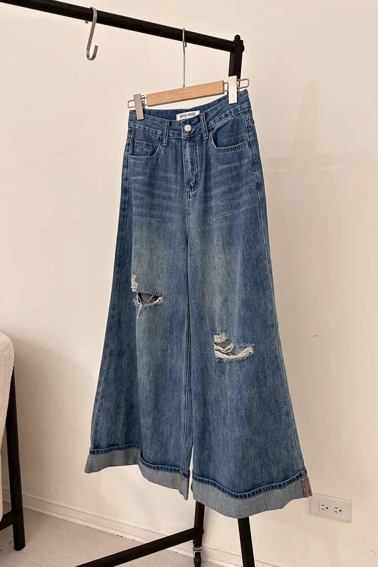 復古破洞牛仔落地寬褲