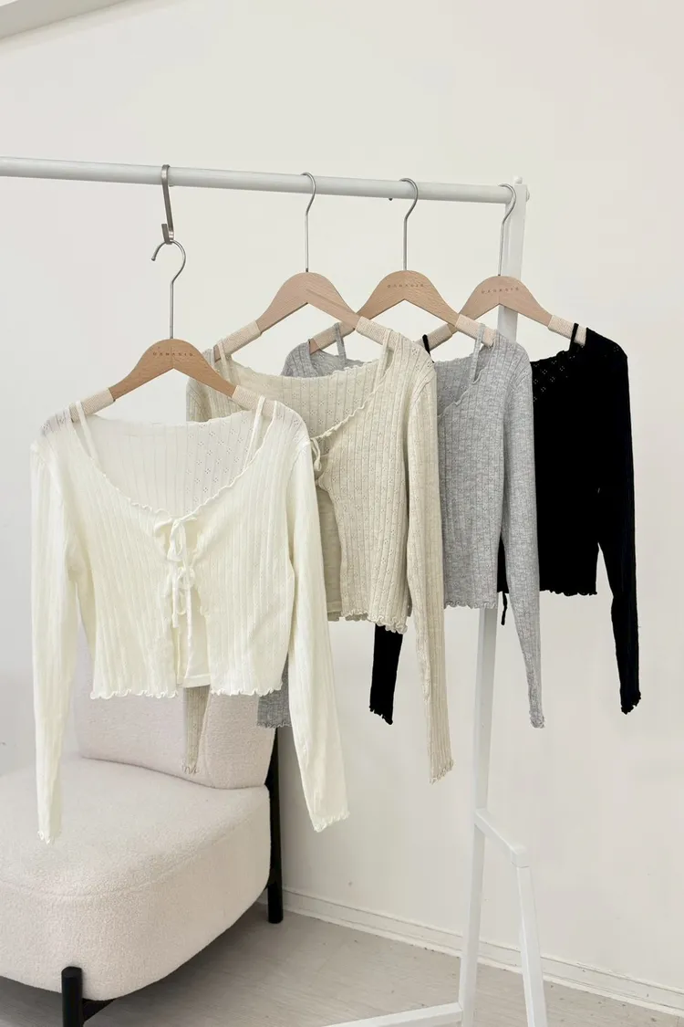 最愛小花壓紋//木耳邊綁繩罩衫SET