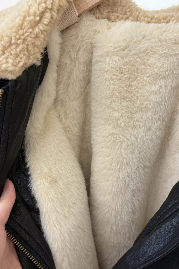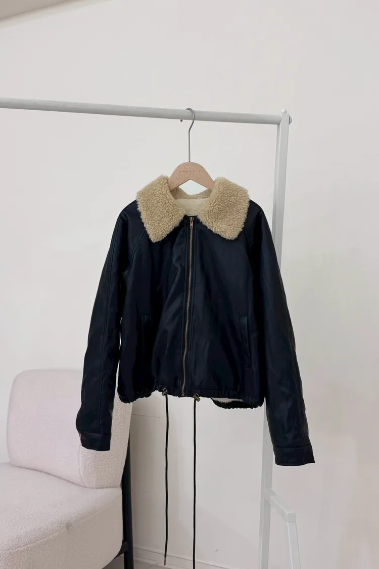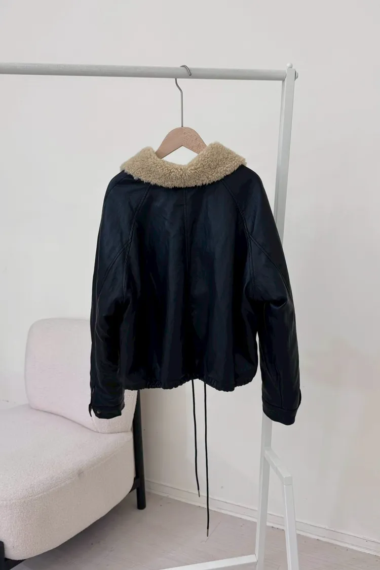 內裡有毛毛//下擺抽繩軟皮革外套