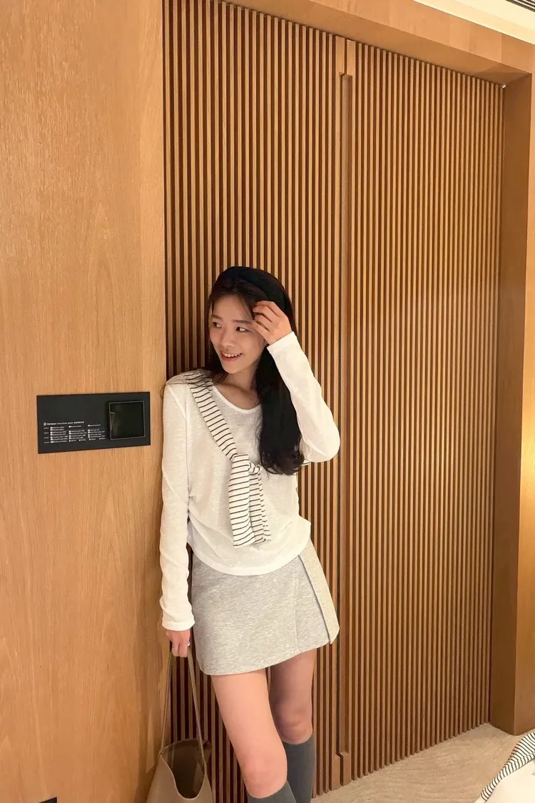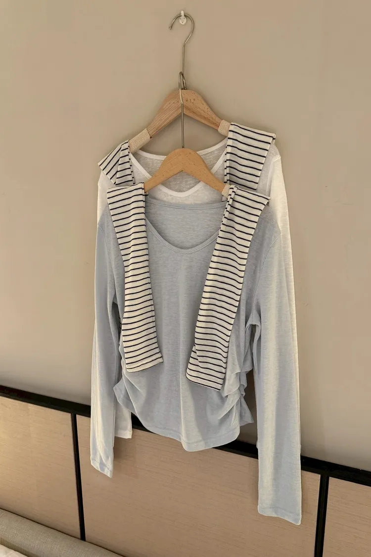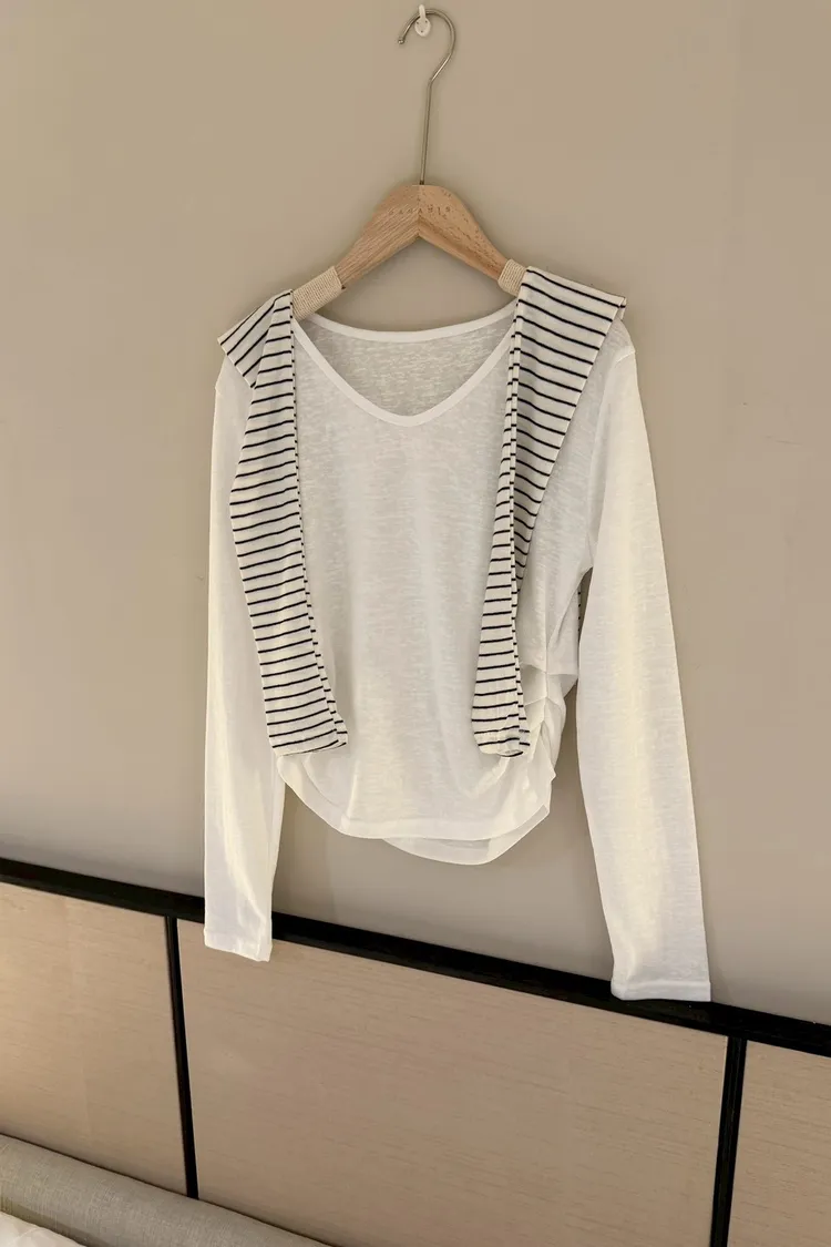 條紋披肩側抓皺薄長袖